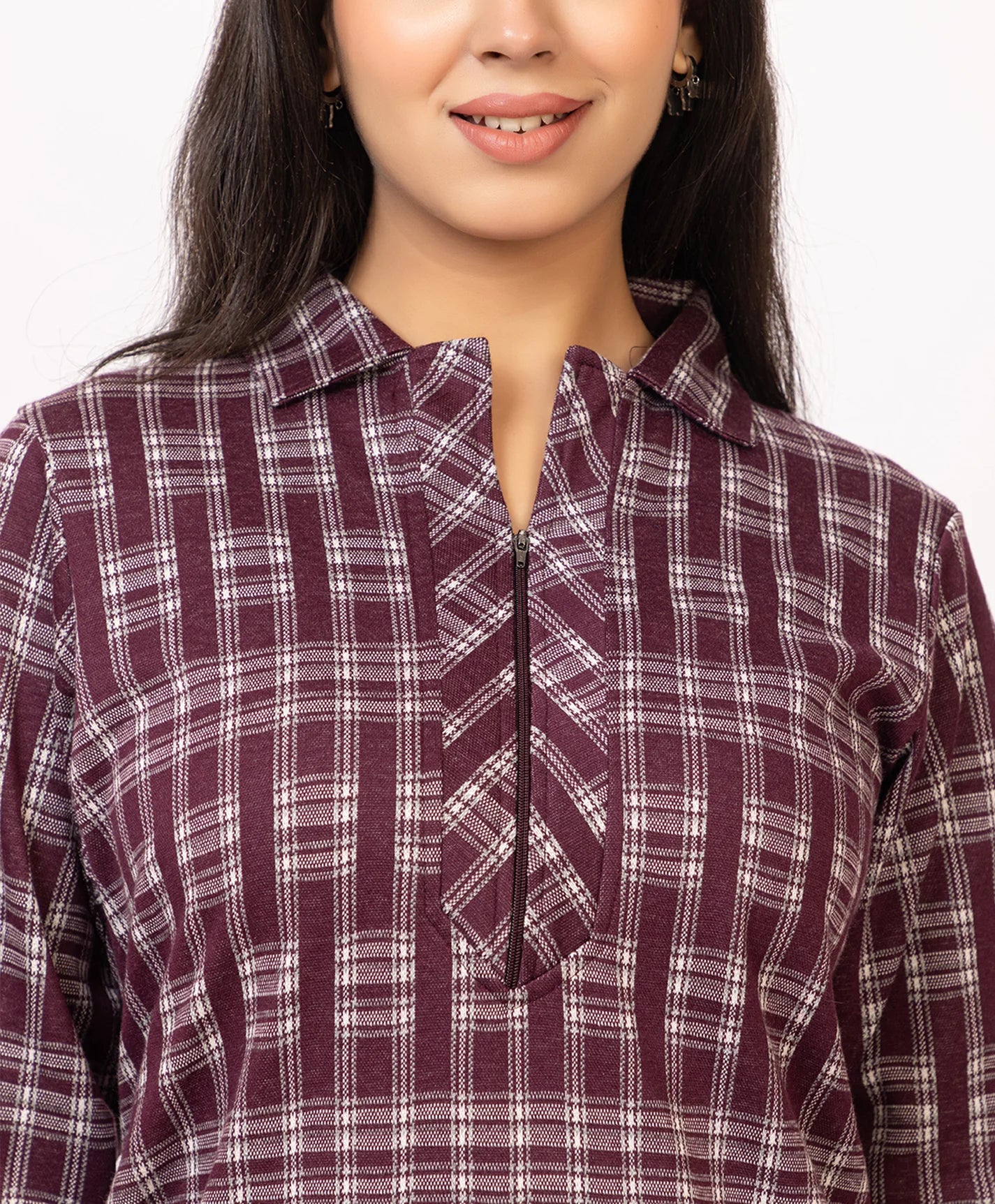 Embrace the season in comfort with this stylish two-piece Kurta and Lower set, crafted from soft, textured imported fabric that offers warmth perfect for the winter months. The ensemble features a straight-cut Kurta with full sleeves and a modern mandarin/band collar neckline with a V-split placket, complemented by subtle piping or lace trim. Both the Kurta and the matching straight-fit trousers (the lower) are adorned with a classic all-over check/plaid pattern, offering a refined look. This set provides a cozy, relaxed fit, making it ideal for comfortable daily wear, casual outings, or warm lounging.