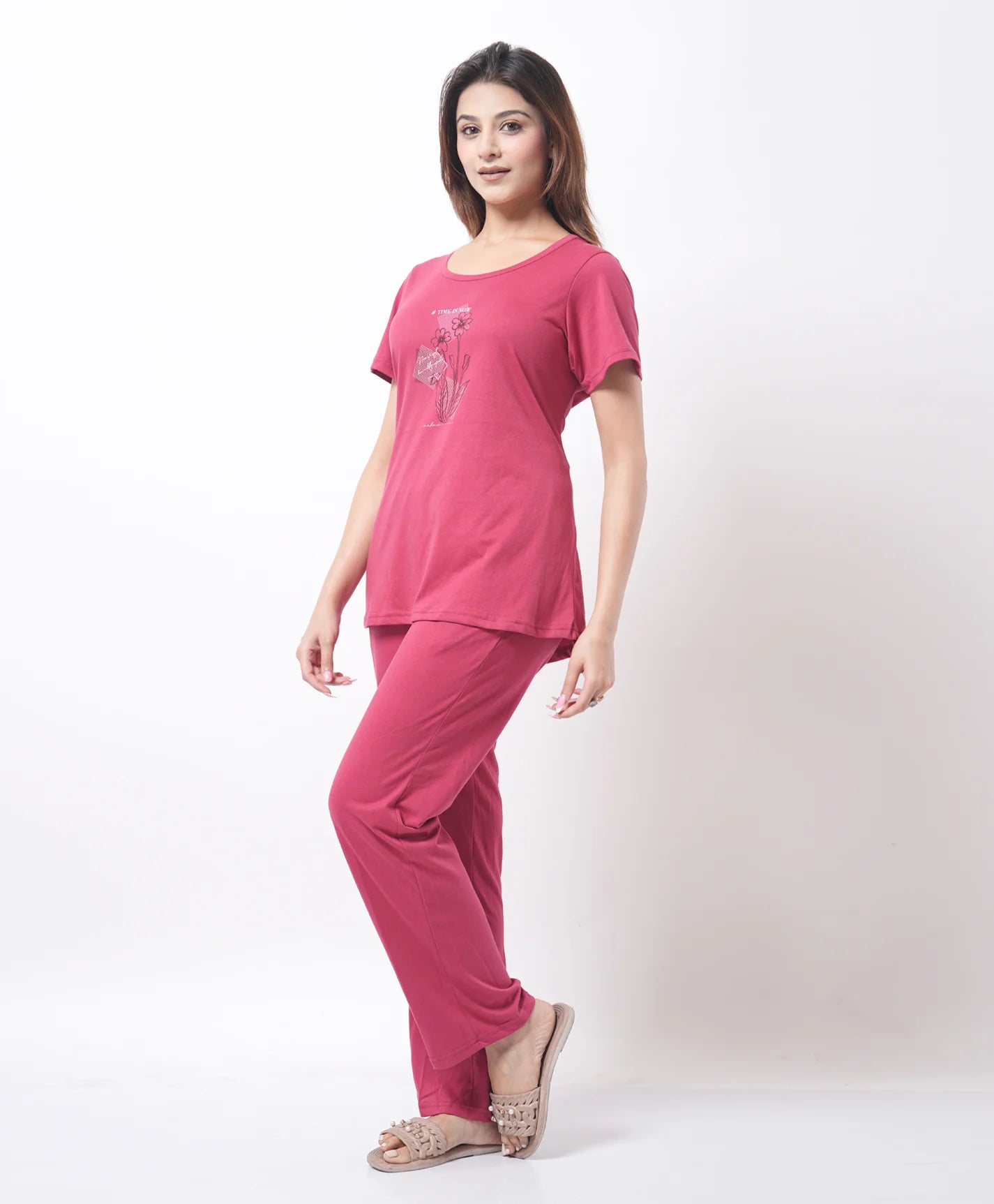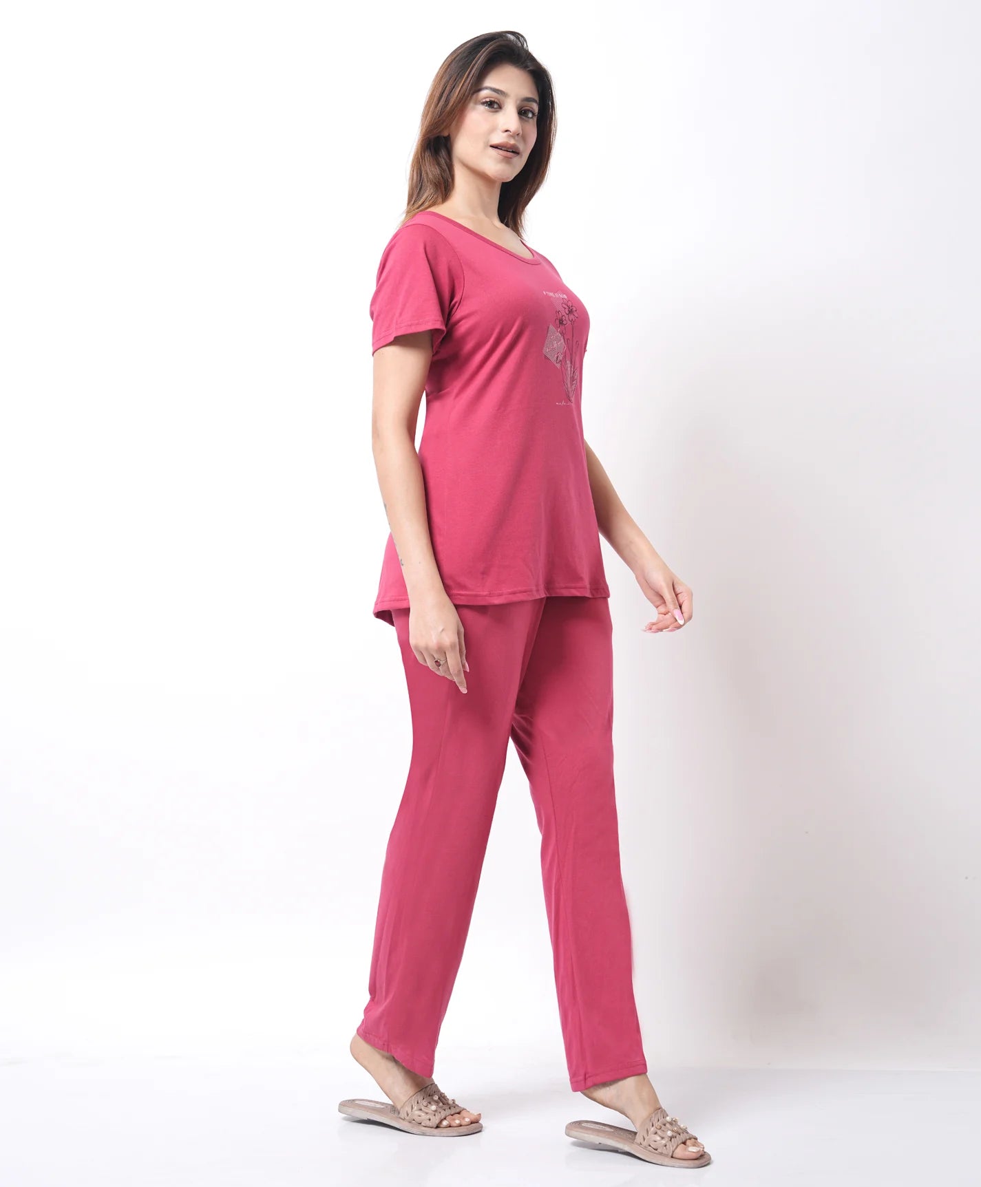 Crafted for comfort lovers, this mid-length night suit features a smooth texture and a breathable feel. The relaxed silhouette supports effortless movement, making it suitable for both sleep and leisure. A go-to option for a calm and comfortable routine.