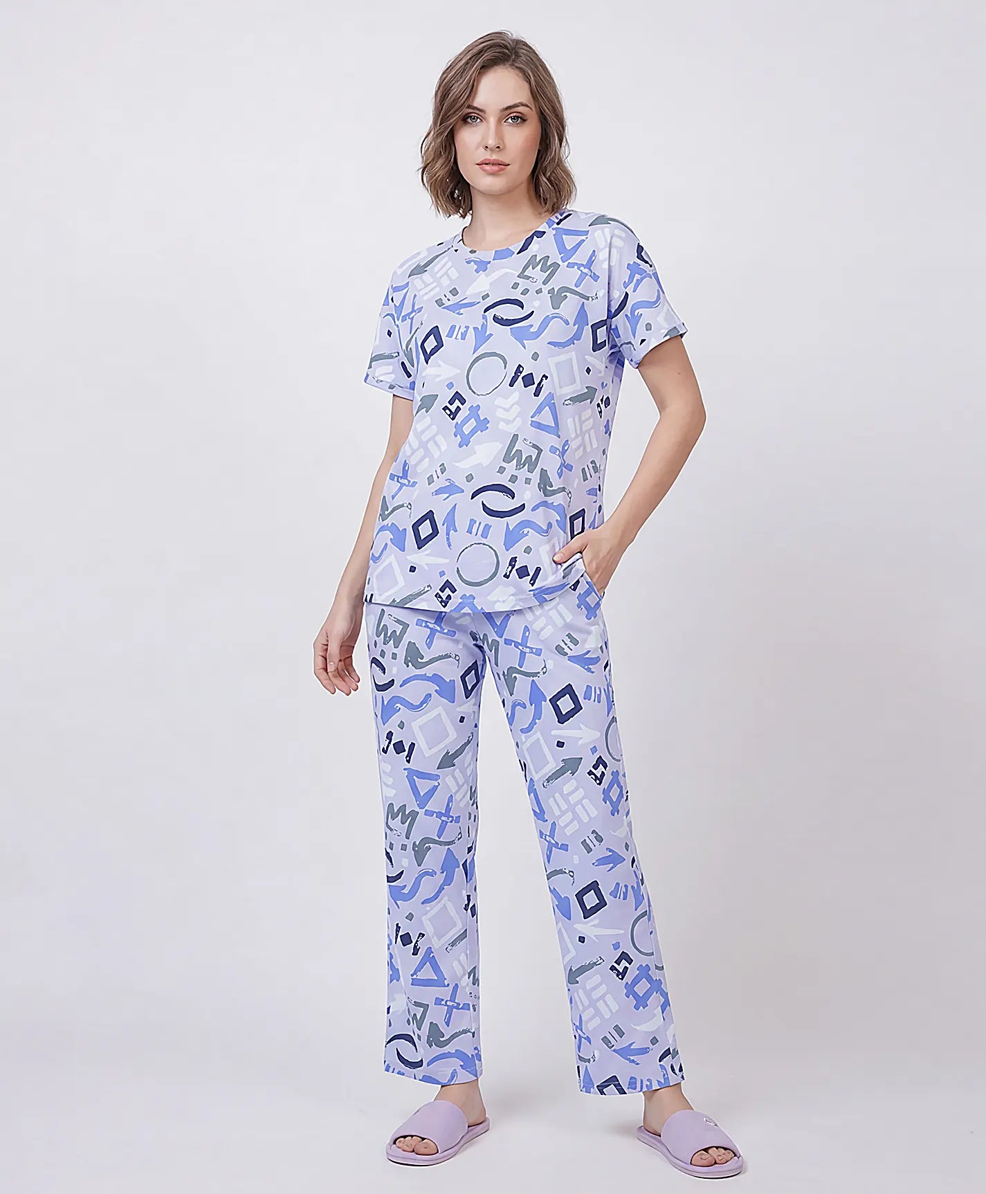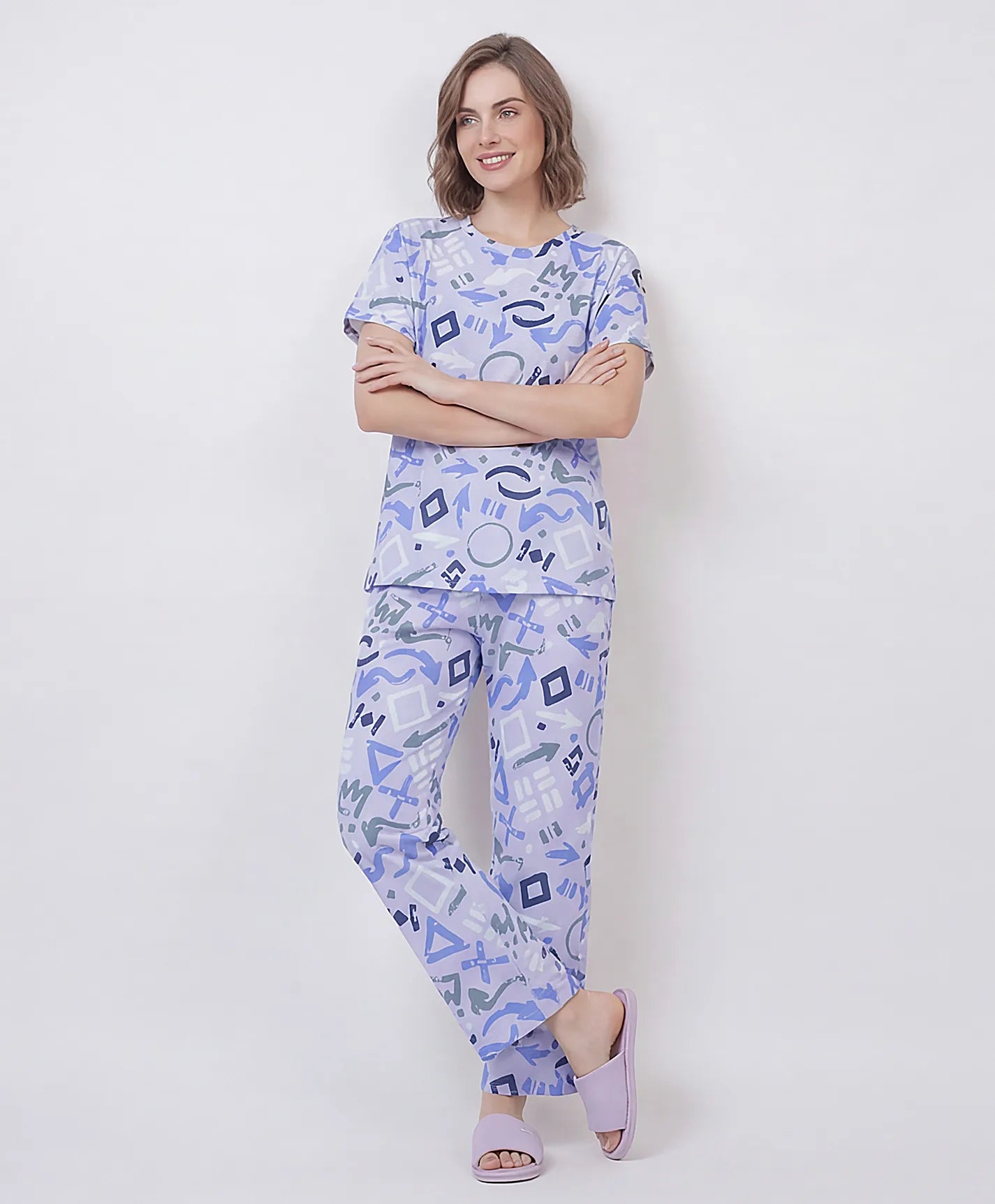 Enjoy a cozy and stylish vibe with this down-shoulder night suit. The soft material provides a smooth feel against the skin, making it ideal for long hours of wear. Designed with a relaxed fit and eye-catching print, it brings comfort with a fashionable twist. Perfect for relaxing evenings at home.