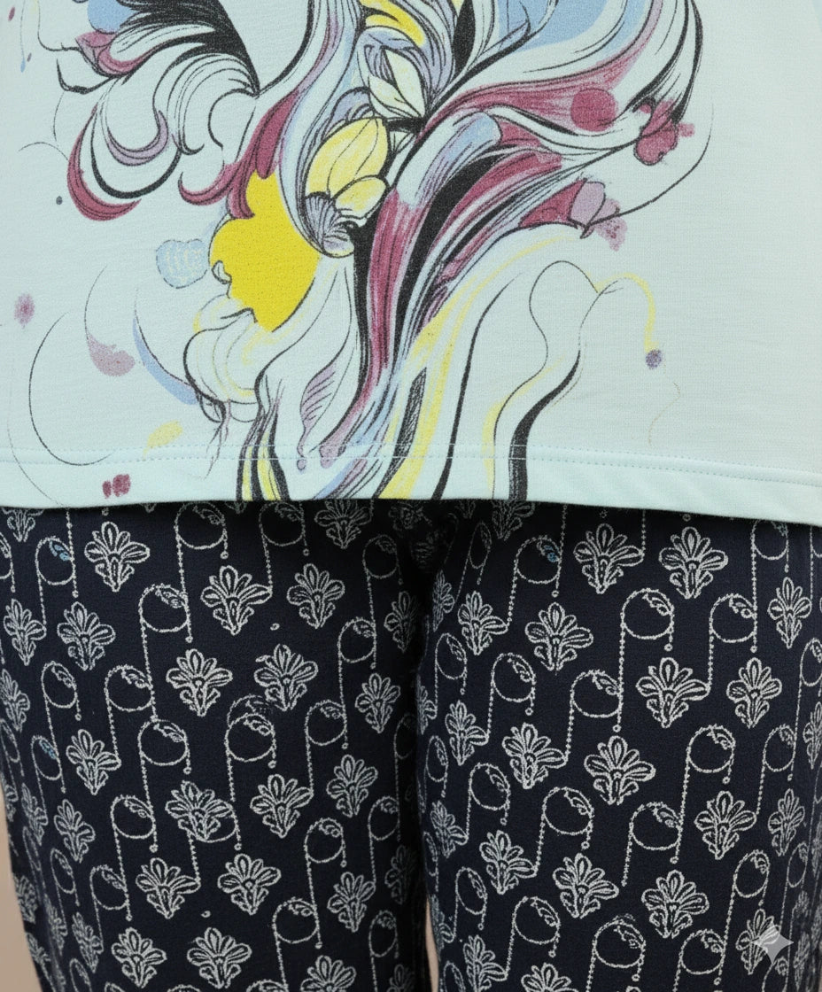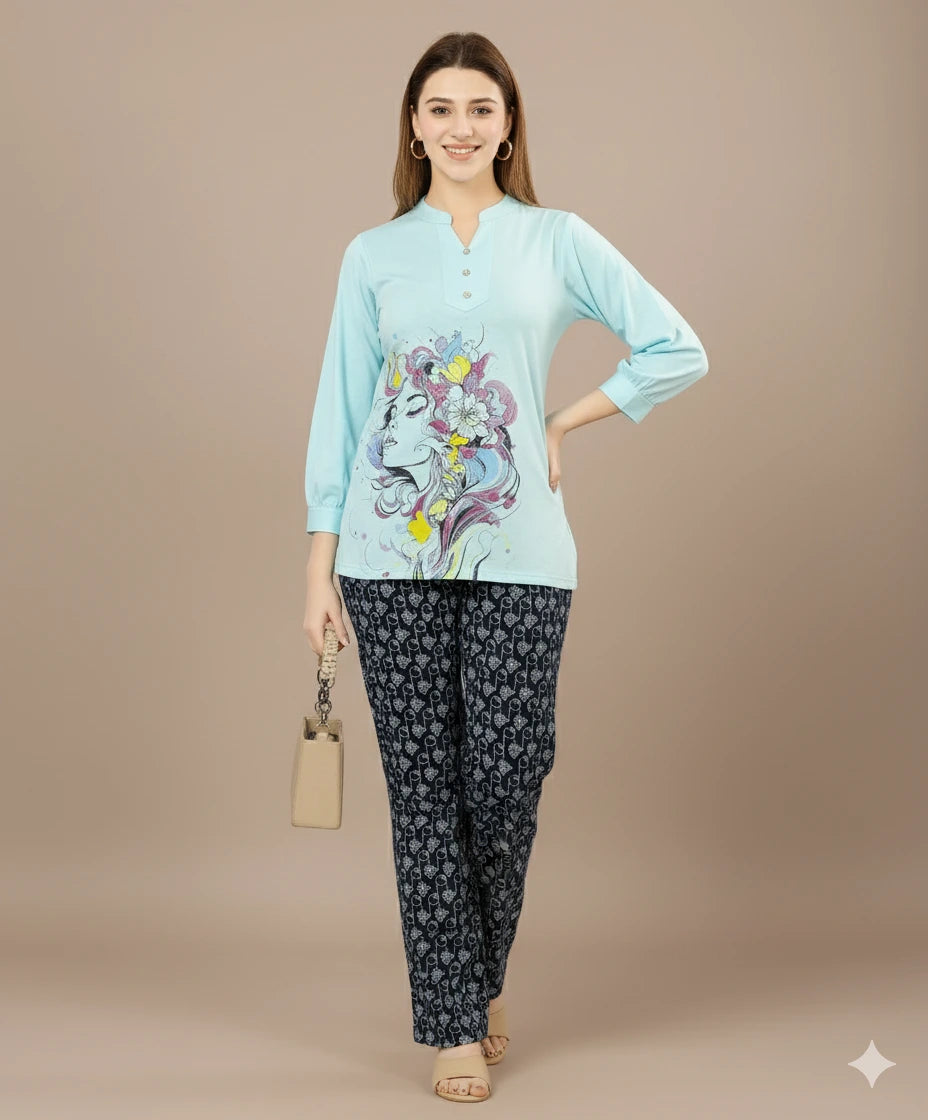 Stay stylish and comfortable in this sky blue printed top and navy bottoms co-ord set. The top features a mandarin collar with button detailing, 3/4th sleeves, and a bold artistic graphic print of a woman with floral accents in pastel and yellow tones. It is paired with navy straight-fit trousers adorned with an all-over light grey abstract motif, giving a trendy contrast. Made from soft, breathable fabric, this set is perfect for lounging, casual outings, or travel.