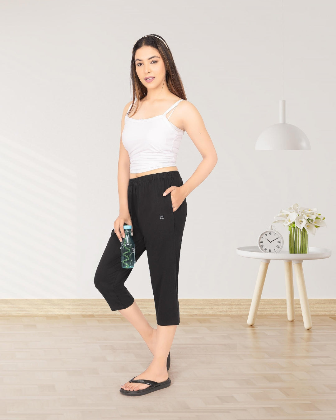 Enjoy all-day comfort with these soft, breathable cotton-polyester capris—designed for movement, style, and ease. The lightweight fabric blends the natural softness of cotton with the durability of polyester, offering a smooth, flexible fit that keeps you cool and comfortable. Whether you're out for a walk, running errands, or relaxing at home, these capris provide the perfect balance of stretch, breathability, and everyday versatility.